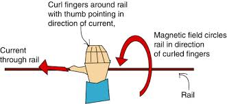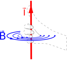لفي أصابع يدك اليمنى حول السلك بحيث يشير الإبهام لاتجاه التيار تشير بقية الأصابع الملفوفة لاتجاه المجال المخناطيسي |