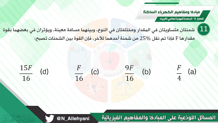 شحنتان متساويتان في المقدار ومختلفتان في النوع ، وبينهما مسافة معينة ، ويؤثران في بعضهما بقوة مقدارها F فإذا تم نقل 25% من شحنة أحدهما للآخر فإن القوة بين الشحنتين تصبح: