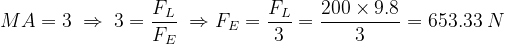 وهي أنه يساوي عددَ الحبال الحاملة للبكرات (واحدة أو اثنتين) الحاملة للثقل أو الحبال التي تشد لأعلى، وهي من الرسم ثلاث حبال، إذن MA=3