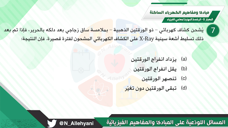 يشحن كشاف كهربائي ذو الورقتين الذهبية بملامسة ساق زجاجي بعد دلكه بالحرير ، فإذا تم بعد ذلك تسليط أشعة سينية على الكشاف الكهربائي المشحون لفترة قصيرة فإن النتيجة: