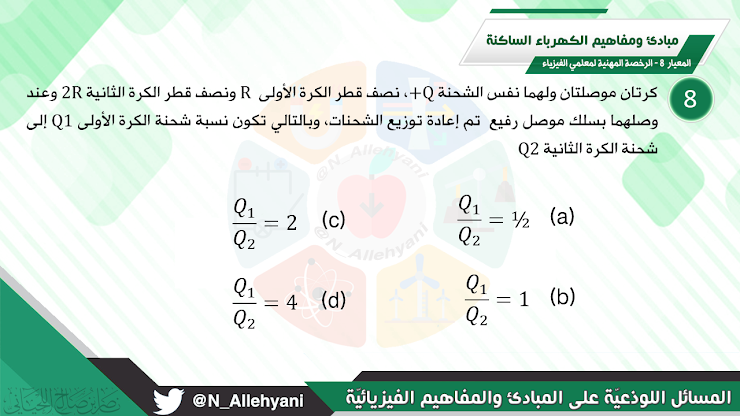 كرتان موصلتان ولهما نفس الشحنة Q+ نصف قطر الكرة الأولى R ونصف قطر الكرة الثانية 2R وعند وصلهما بسلك موصل رفيع تم إعادة توزيع الشحنات وبالتالي تكون نسبة شحنة الكرة الأولى إلى نسبة شحنة الكرة الثانية هي